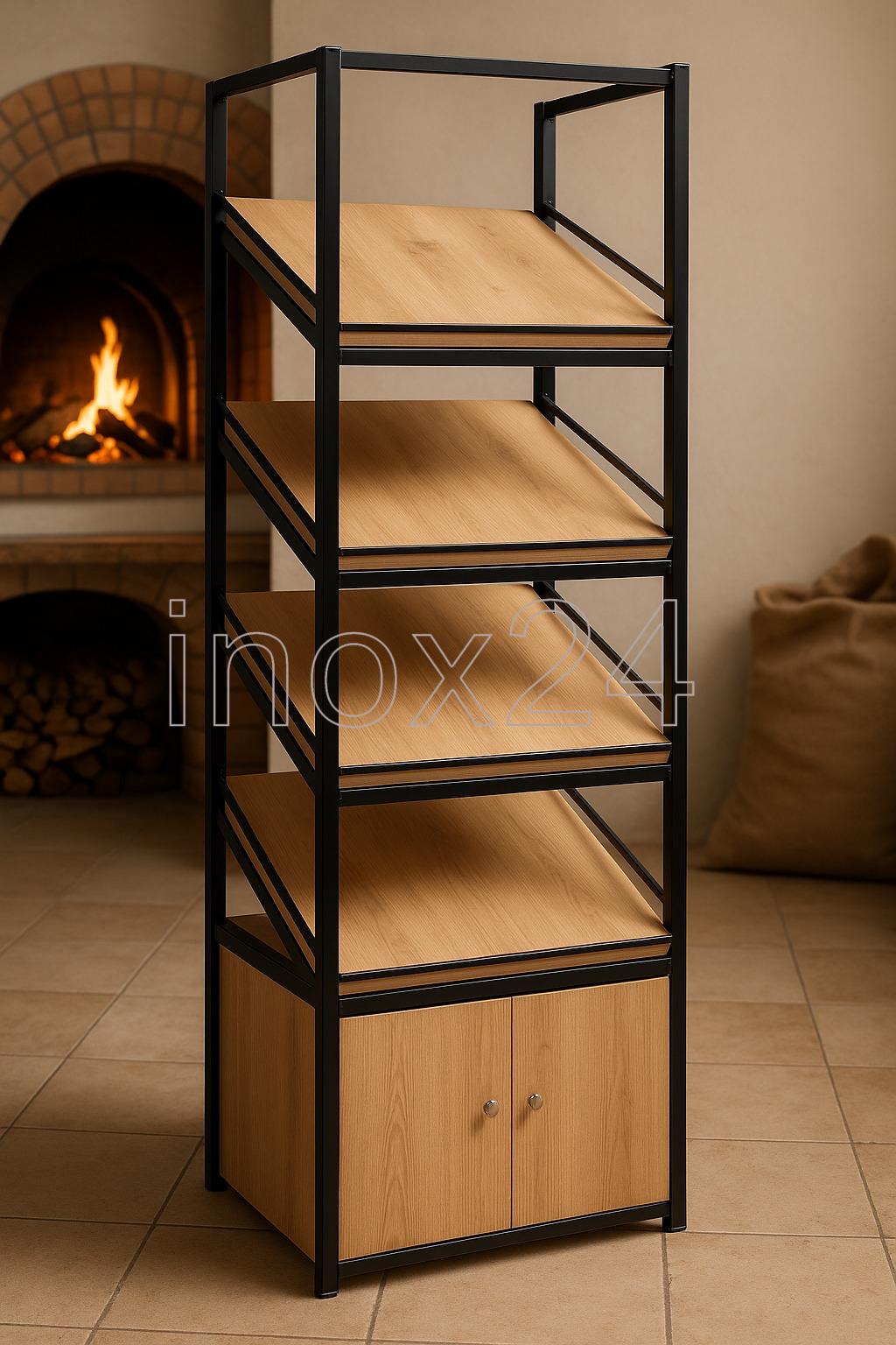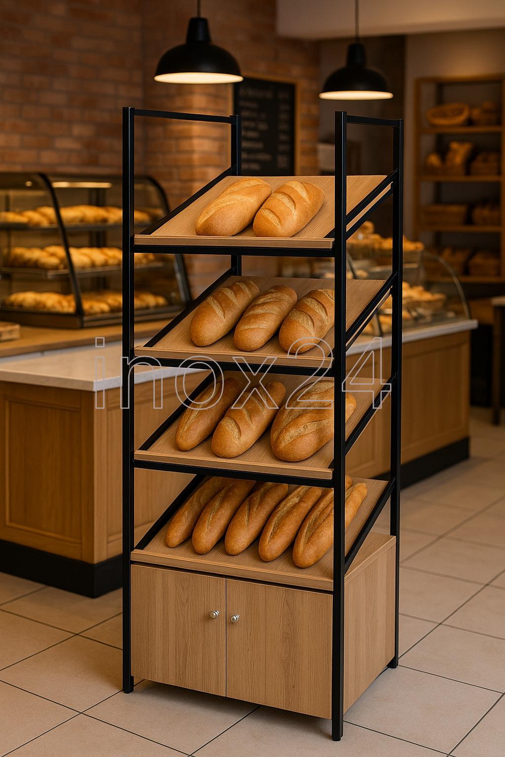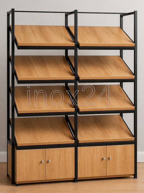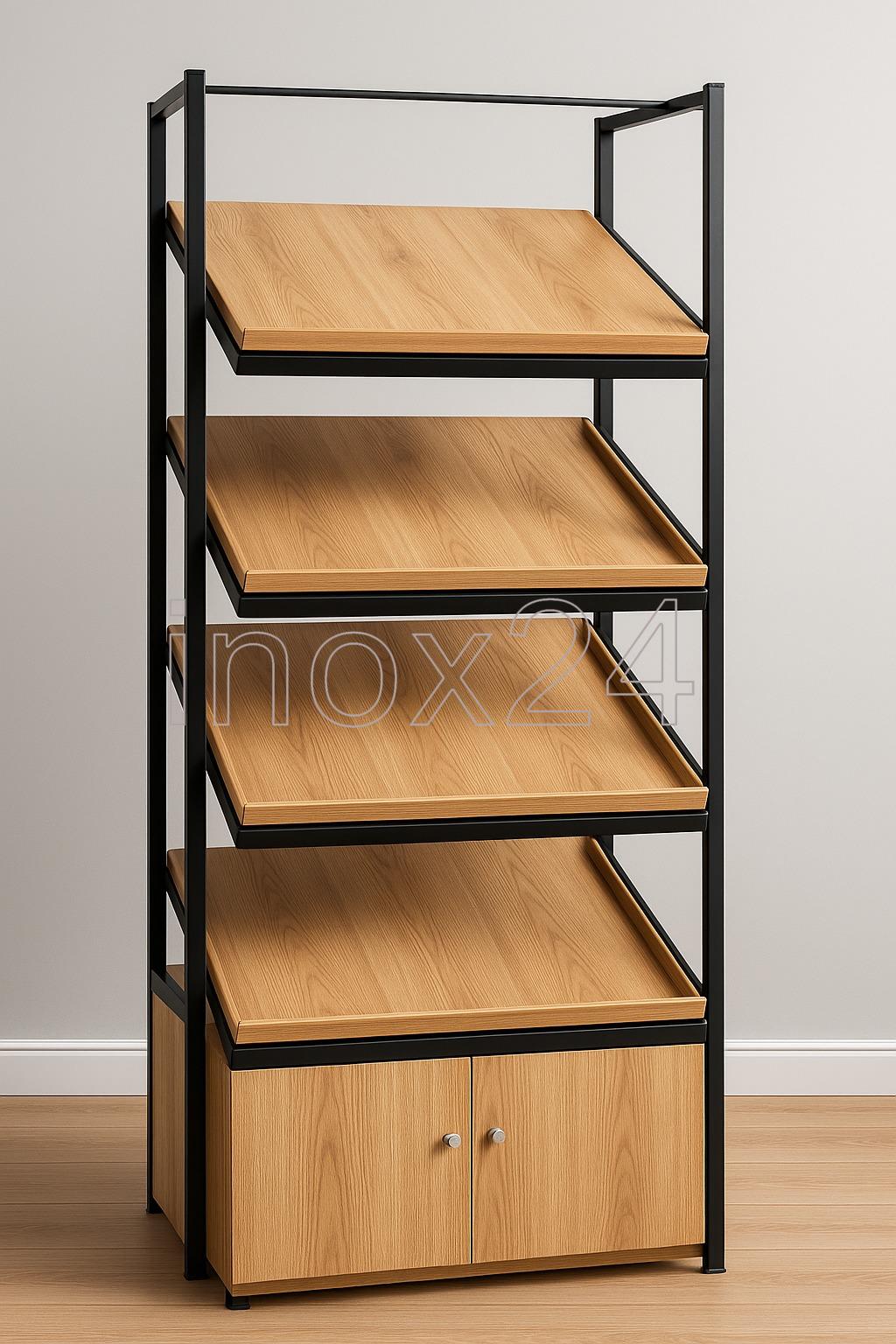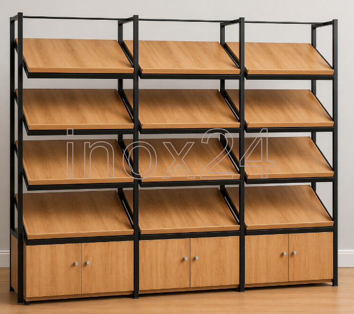 Επαγγελματική ραφιέρα προβολής προϊόντων, σχεδιασμένη για καταστήματα λιανικής, αρτοποιεία, ζαχαροπλαστεία και χώρους εστίασης που απαιτούν λειτουργικότητα και υψηλή αισθητική. Η κατασκευή συνδυάζει μεταλλικό σκελετό υψηλής αντοχής με ράφια επένδυσης ξύλου, προσφέροντας σύγχρονη industrial εμφάνιση και μεγάλη ανθεκτικότητα στη χρήση.