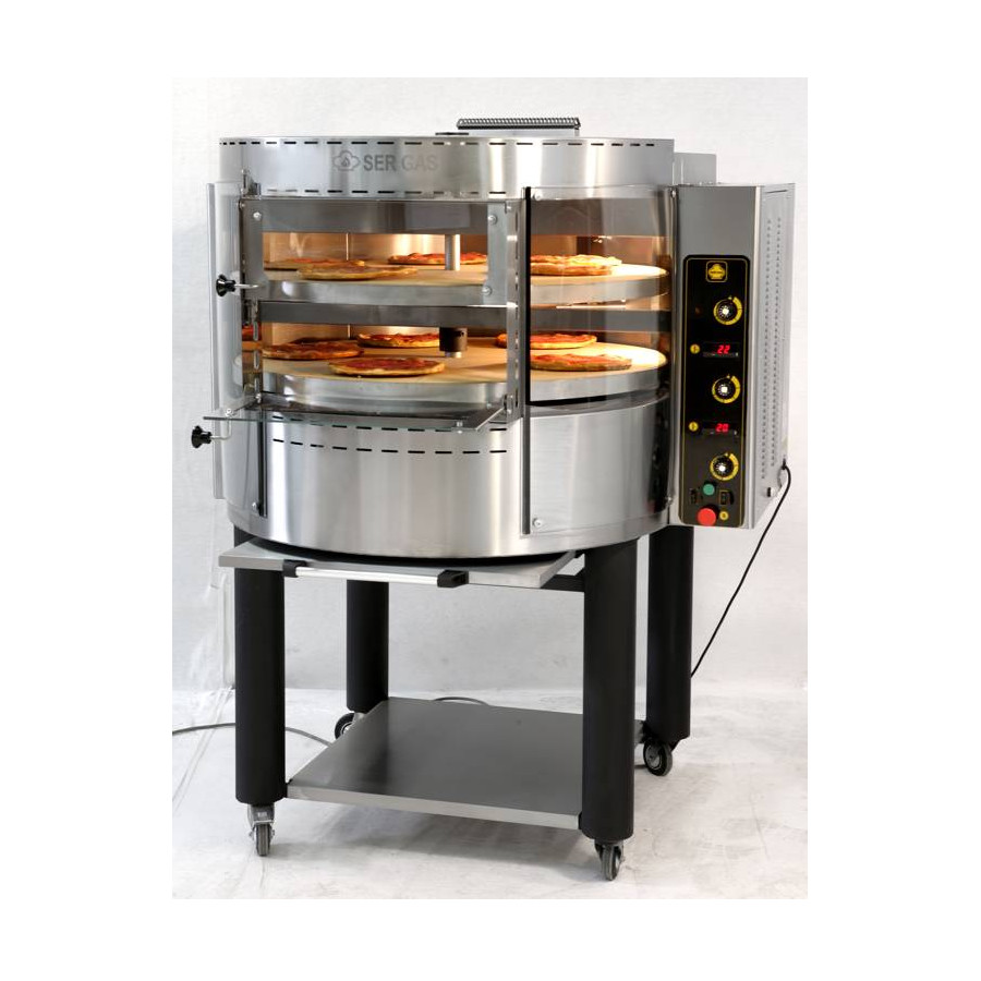 Ανοιχτός φούρνος πίτσας υγραερίου κυκλικής σχεδίασης με καμπυλωτές βιτρίνες και άπλετο φωτισμό που επιτρέπει την άμεση επιτήρηση της διαδικασίας ψησίματος επάνω σε περιστρεφόμενη κεραμική πλάκα
