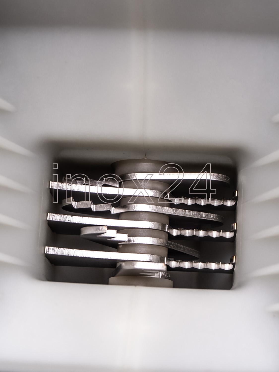 Η τροφοδοσία πάγου γίνεται εύκολα από χοάνη με μεγάλη διάμετρο και διαφανές καπάκι. Τα τοιχώματα διπλής μόνωσης γύρω από την περιοχή θρυμματισμού μειώνουν τις απώλειες πάγου και αποτρέπουν τη δημιουργία πάγου στο εξωτερικό μέρος. Τα μαχαίρια υψηλής αντοχής από ανοξείδωτο χάλυβα πάχους 3mm εξασφαλίζουν αποτελεσματικό και γρήγορο θρυμματισμό.