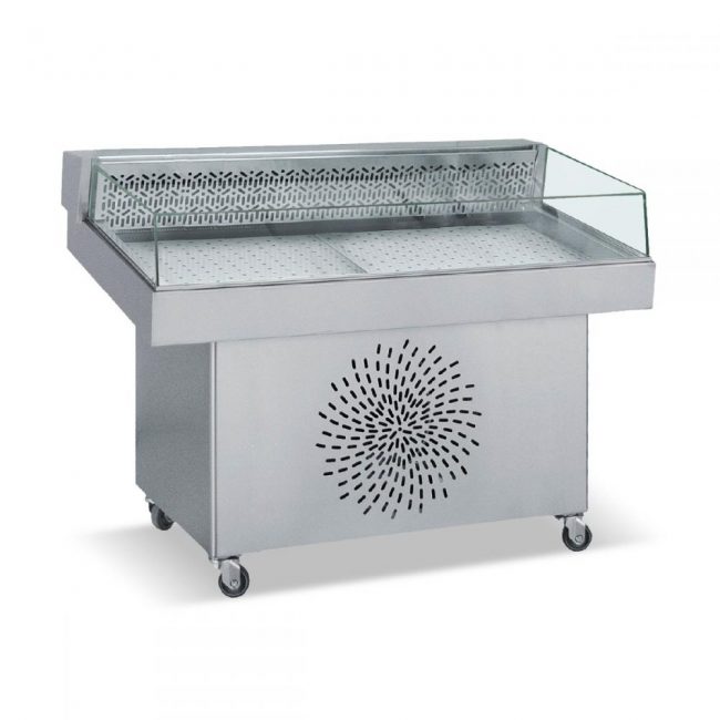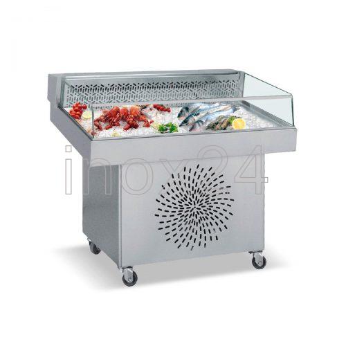 Επαγγελματική βιτρίνα ψυχόμενη με κεκλιμένη πρόσοψη, σχεδιασμένη ειδικά για self-service παρουσίαση προϊόντων όπως ψάρια και θαλασσινά επάνω σε πάγο. Κατασκευασμένη πλήρως από ανοξείδωτο χάλυβα υψηλής αντοχής, εξασφαλίζει αντοχή και εύκολο καθαρισμό. Διαθέτει μόνωση από οικολογική πολυουρεθάνη πάχους 5 cm και σύστημα ψύξης με φυσική κυκλοφορία αέρα. Περιλαμβάνει ψηφιακό θερμοστάτη, δυνατότητα αυτόματης απόψυξης και LED φωτισμό για βέλτιστη προβολή. Ο οικολογικός ψυκτικός κύκλος με R290 και οι ρόδες με φρένα επιτρέπουν εύκολη τοποθέτηση, λειτουργικότητα και μειωμένο ενεργειακό αποτύπωμα.