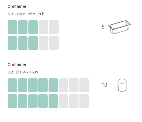 Χωρητικότητα:  6x (5Lt | 360 x 165 x 120h)  ή 10x (3Lt | ∅154 x 160h)