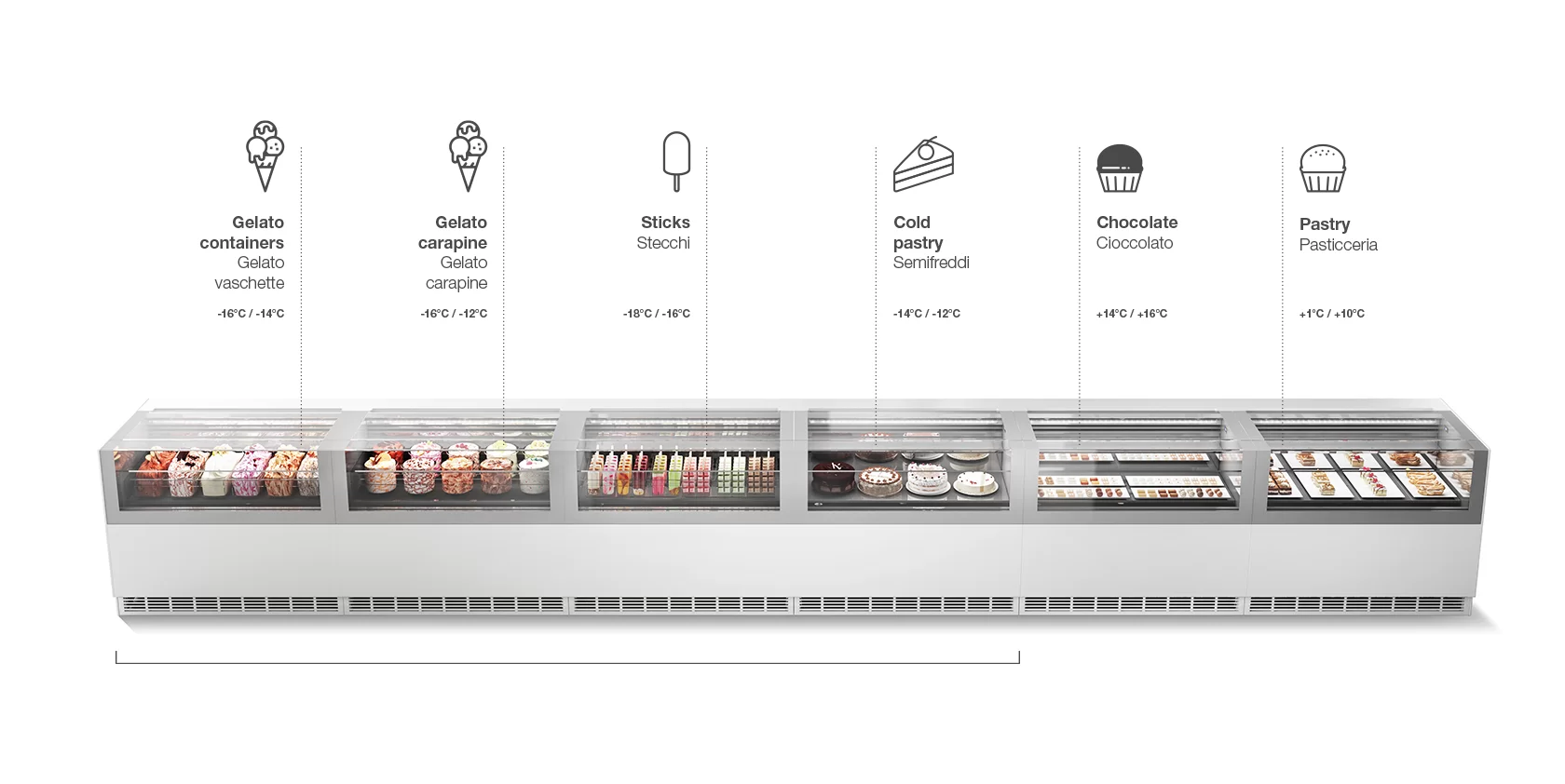 Η σειρά Oneshow μπορεί προαιρετικά να παραδοθεί με Dual Temperature, επιτρέποντας τη μετατροπή της βιτρίνας από gelato σε pastry και αντίστροφα, προσφέροντας εποχιακή ευελιξία χωρίς επιπλέον χώρο.
